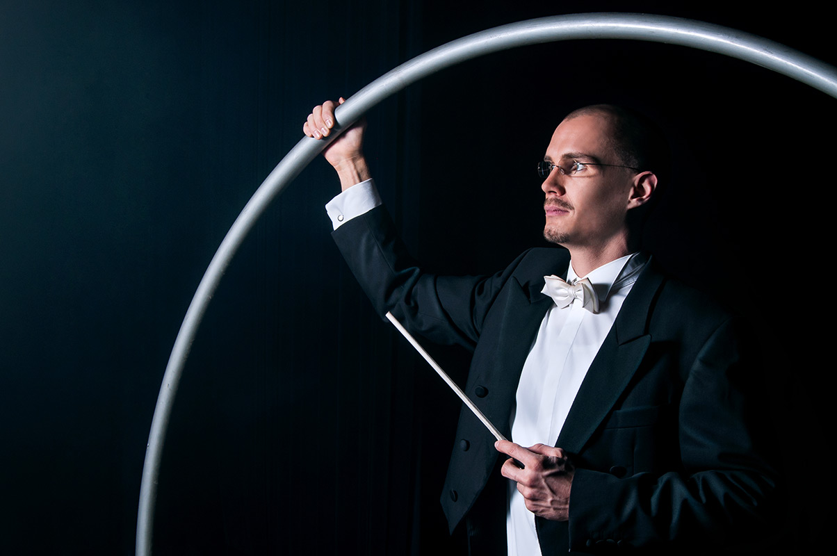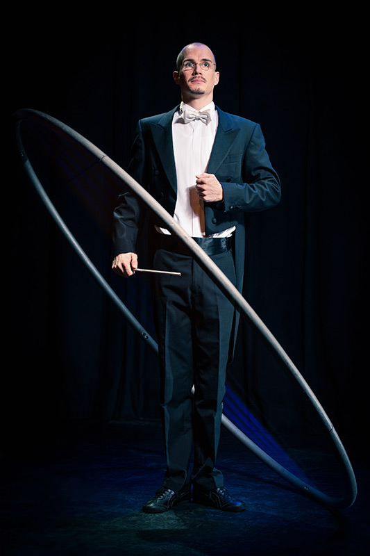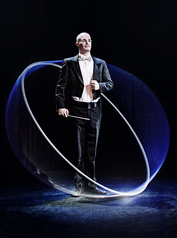 Vielseitigkeit spiegelt sich in seinen Darbietungen wider: Zum einen elegant, kunstvoll und präzise in seiner Rolle als Dirigent, zum anderen frisch und voller Esprit in der Performance Rotation. Egal, ob klassisch elegant oder spritzig und kraftvoll: Beide Nummern vereinen akrobatische Glanzleistungen und Gefühl und ziehen das Publikum in den Bann der Schwerelosigkeit.