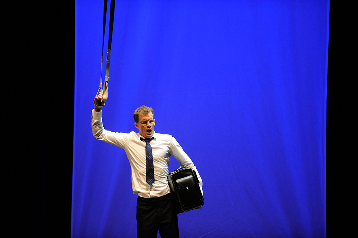 In seiner Darbietung macht Herr Benedict die Strapaten zu Haltegriffen einer U-Bahn und verfällt auf dem Weg zur Arbeit in einen Tagtraum. Ausdrucksvoll und mit scheinbarer Leichtigkeit bringt er eine Dramatik in die Lüfte, die sowohl (Auf)Schwung als auch den Fall thematisiert.